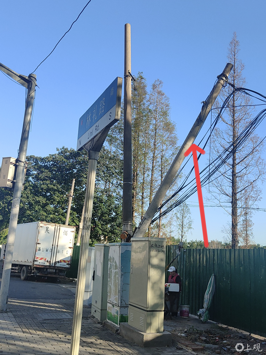记者根据郭先生提供的线索来到现场,只见在林礼路东侧的人行道旁,一根水泥杆明显向一侧倾斜,与地面形成约60度夹角,令人揪心。杆体上缠绕着多条电线,在微风中轻轻晃动,仿佛随时可能彻底倾倒。旁边就是行人往来的步道,还有车辆在附近行驶,一旦杆子倒下,不仅会对行人安全造成直接威胁,还可能挂断电线、砸损周边设施,后果不堪设想。