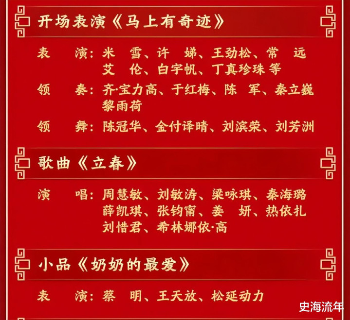 开场即高潮,马年意象贯穿始终。 晚会以《马上有奇迹》盛大开场,米雪、许娣、王劲松、常远等演员,在齐·宝力高、于红梅等艺术家的领奏下,配合陈冠华等领舞的精彩演绎,瞬间点燃喜庆氛围。紧随其后的歌曲《立春》,由周慧敏、刘敏涛、梁咏琪、秦海璐、薛凯琪、张钧甯等两代女星联袂献唱,以温柔而有力的歌声,宣告着春天与希望的来临。